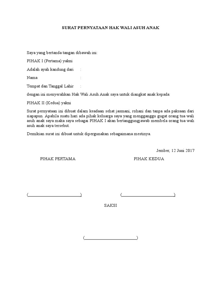 Surat Keterangan Wali Anak. SURAT KETERANGAN IJIN ORANG TUA DAN WALI Yang bertanda tangan di bawah ini : a. Pernyataan wali nikah ini dibuat jika wali tidak bisa menikah-kan sendiri anaknya jadi biasanya dia akan menunjuk orang lain sebagai wakil untuk Semoga dengan adanya Contoh Surat Pernyataan Wali Nikah tersebut bisa bermanfaat bagi kita semua.
