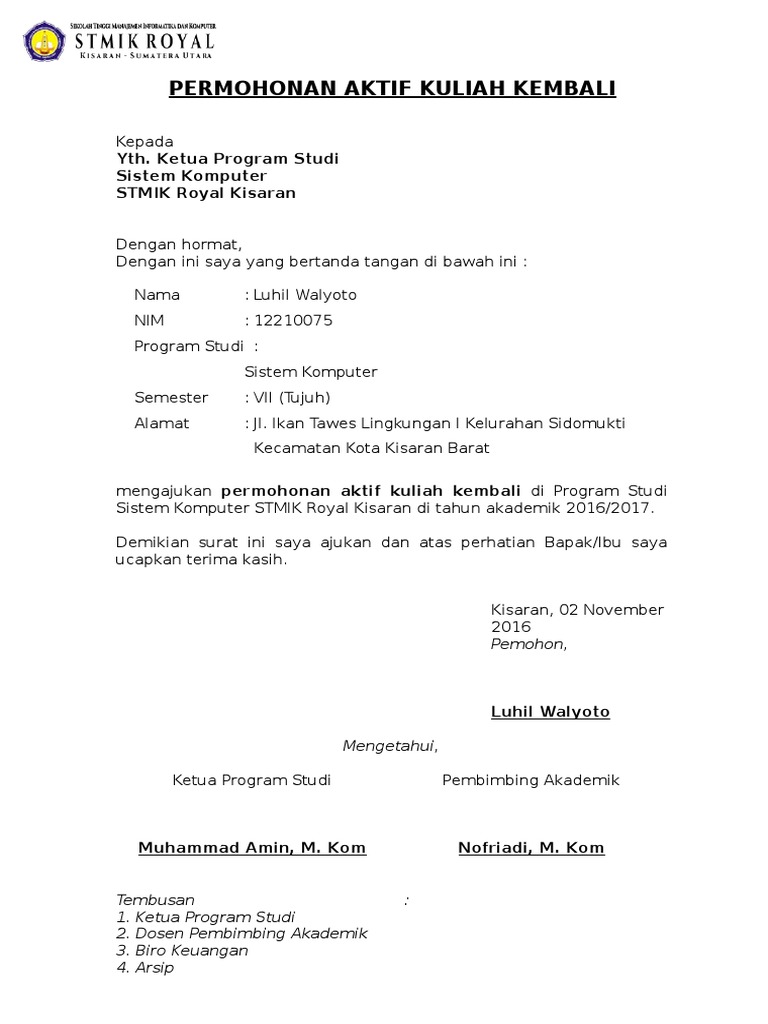 Surat Keterangan Aktif Kuliah. Nama Instansi Isikan dengan nama instansi/Lembaga yang menerbitkan surat. jenis Instansi Kolom ini akan ditampilkan di atas nama Instansi pada kop surat. Mahasiswa terdaftar di semester aktif saat pengurusan surat Surat keterangan aktif kuliah setelah selesai diprosesakan diberitahukan pada mahasiswa via Surat keterangan kuliah dapat unduh di bawah ini Bagi mahasiswa yang memerlukan Surat Keterangan Aktif Kuliah, silahkan unduh file yang tertera di halaman ini.