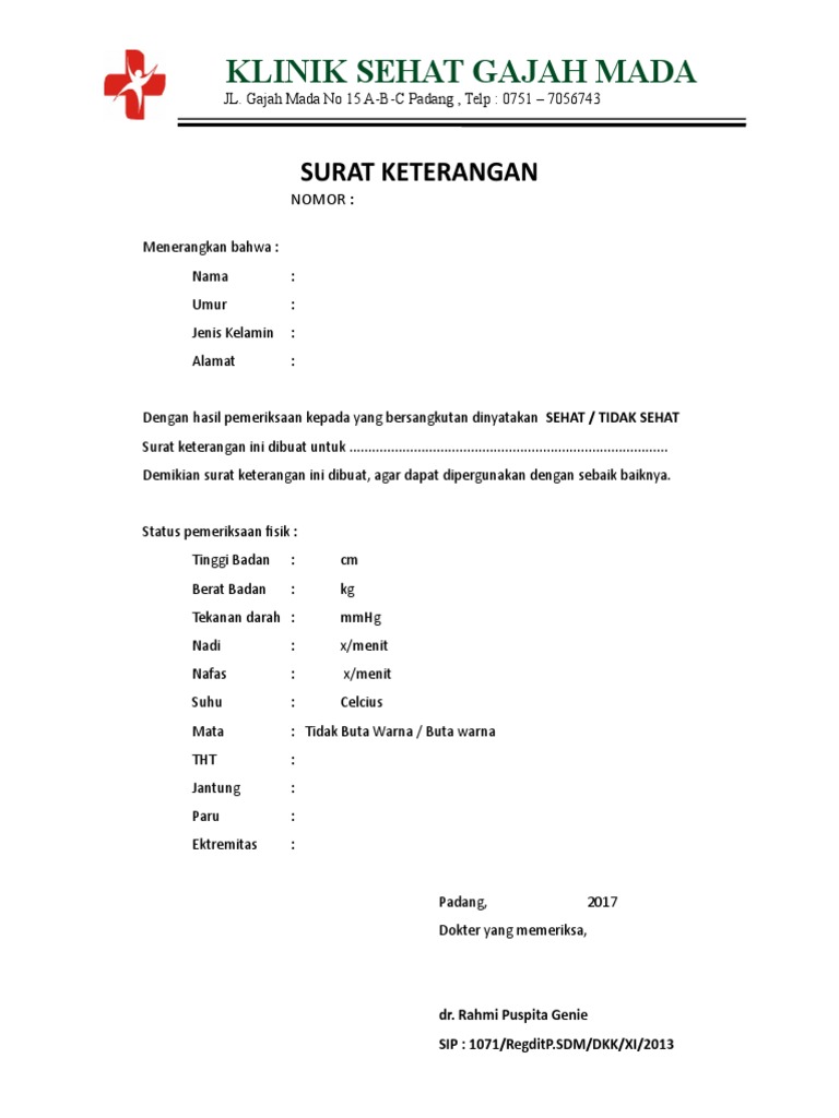 Dengan ini diberitahukan bahwa, Keterangan Laik Sehat (sebutkan Objek TTU di IKL)…. Surat keterangan sehat dokter merupakan sebuah surat yang ditujukan kepada sebuah instansi yang meminta, seperti sekolah, kantor, atau tempat kerja sebagai suatu keterangan bahwa kita memiliki kesehatan yang disyaratkan serta dapat melakukan aktivitas dalam lingkungan kerja atau sekolah. Nomor: … Menerangkan bahwa: Nama Umur Jenis Kelamin Alamat.