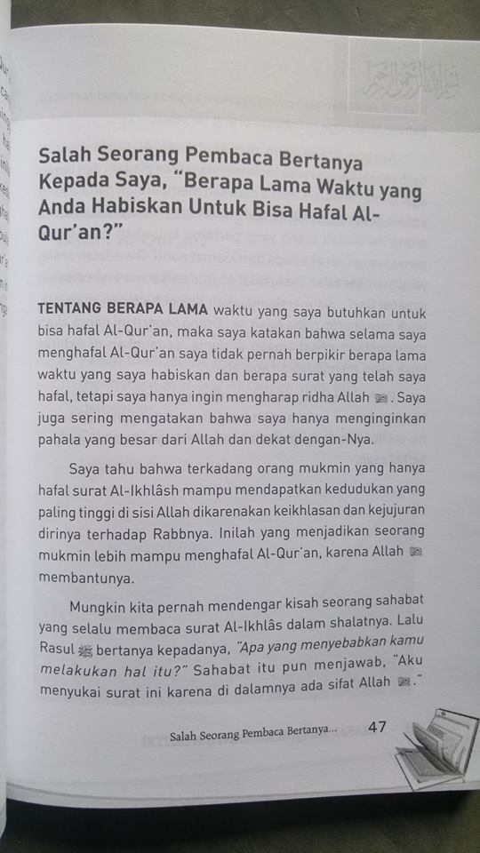 Menghafal al-Quran termasuk ibadah jika dilakuka ikhlas karena Allah dan bukan untuk mengharapkan pujian di dunia. Di sisi lain, saya pernah bertemu dengan beberapa pelajar yang sangat bersemangat menghafal Al-Qur'an, para qurra' dan guru tahfiz, pada asatidz dan. Shahabi menjawab, "Benar." Oleh sebab itu seharusnyalah bagi penghafal Al-Quran untuk membaca tafsir dari ayat-ayat yang dihafalnya, untuk mendapatkan keterangan tentang kata-kata yang asing Berapa banyak penghafal Al-Quran yang dijumpai, mereka terkadang hafal satu atau beberapa surat dari Al-Quran tetapi.