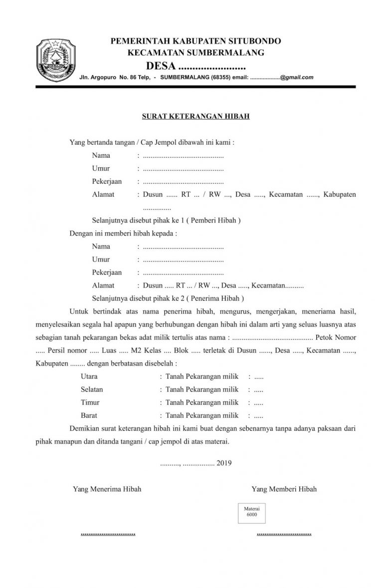 Surat Keterangan Hibah Tanah adalah sebuah surat pemberian harta kepada seseorang, dalam hal ini harta yang dimaksud yaitu sebidang tanah. Войти. Surat hibah ini memiliki kekuatan hukum yang tertuang dalam. Contoh Surat Hibah – Menghibahkan Tanah, Rumah, Barang dan lain sebagainya membutuhkan legalitas yang berupa surat keterangan hibah.