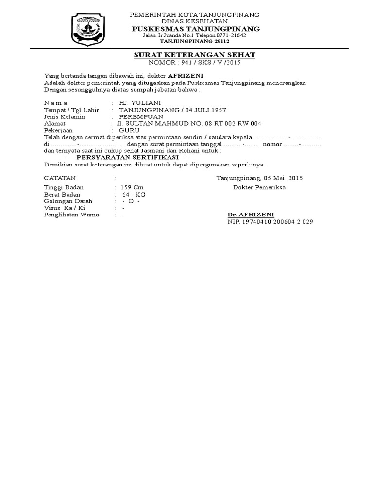 Syarat administrasi untuk melamar pekerjaan terkadang membutuhkan Surat Keterangan Sehat Jasmani dan Rohani. Nah, berikut surat keterangan jasmani dan rohani yang diberikan oleh dua dokter tersebut. Baca juga: Istri PNS, TNI/Polri Diperbolehkan Daftar Banpres Produktif, Berikut Syarat dan Dokumen yang Diperlukan.