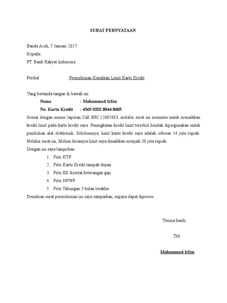 Surat Pernyataan Kenaikan Limit Kartu Kredit | PDF
