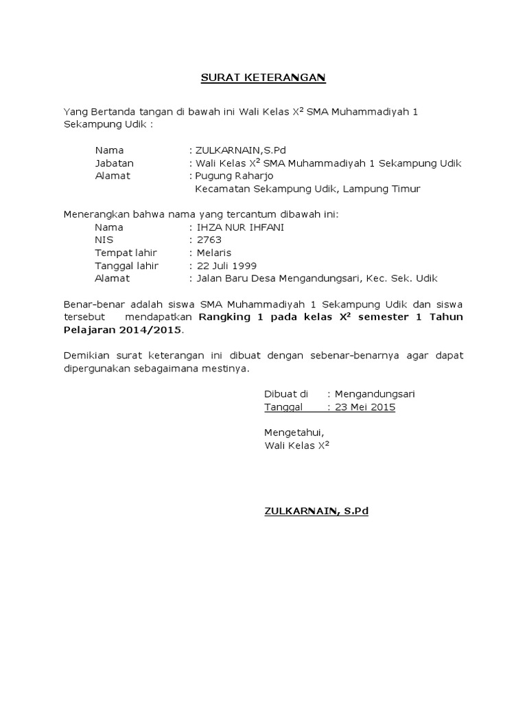 Surat Keterangan Peringkat Kelas