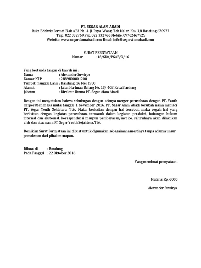 Surat Pernyataan Perubahan Nama Perusahaan