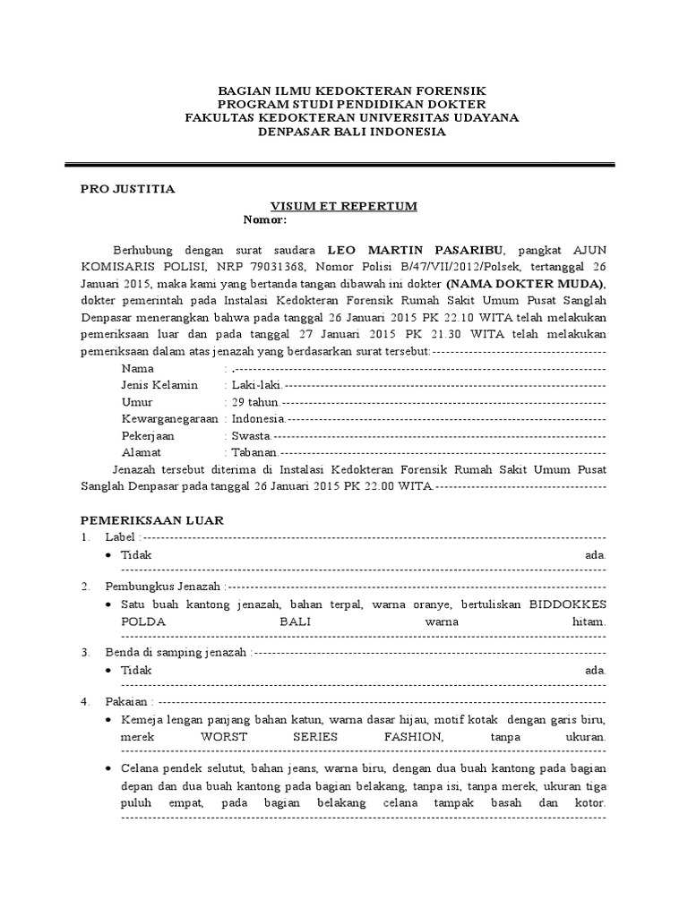 CONTOH SURAT VISUM ET REPERTUM (VER) – Surat Visum et Repertum ( VR) adalah sebuah surat yang secara resmi dikeluarkan oleh pihak tenaga ahli ( dokter forensik atau dokter) perihal pemeriksaan yang dilakukan terhadap luka-luka atau jenazah yang nantinya dalam surat ini akan. Surat Keterangan Visum Et Repertum Format Unhas Korban Hidup. You can save this image to your PC or other Gadget for free.