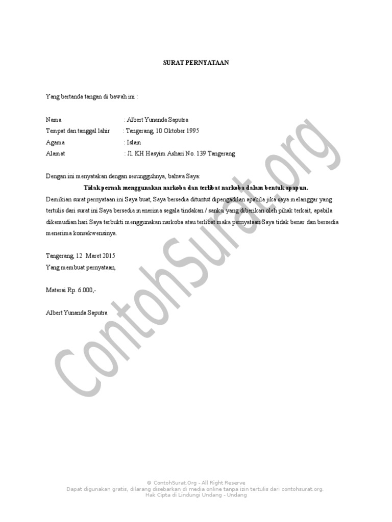 Contoh Surat Pernyataan Bebas Narkoba Bermaterai – Berbagi … (Rena Lawrence)