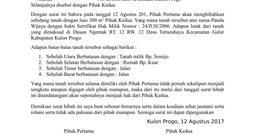Contoh Surat Penyataan Perjanjian Hibah Tanah Pekarangan.