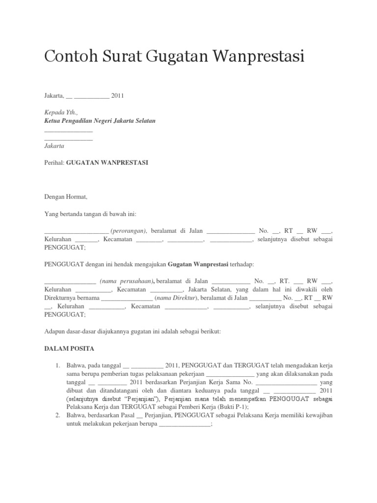 Contoh Surat Gugatan Wanprestasi. Wanprestasi merupakan pelaksanaan kewajiban yang tidak dipenuhi atau ingkar janji atau kelalaian yang dilakukan oleh pihak debitur baik karena tidak melaksanakan apa yang telah diperjanjikan maupun telah. Surat Gugatan adalah suatu surat yang diajukan oleh penggugat kepada Ketua Pengadilan yang berwenang, yang memuat tuntutan hak yang di dalamnya mengandung suatu sengketa dan sekaligus merupakan dasar landasan pemeriksaan perkara dan pembuktian kebenaran suatu hak.