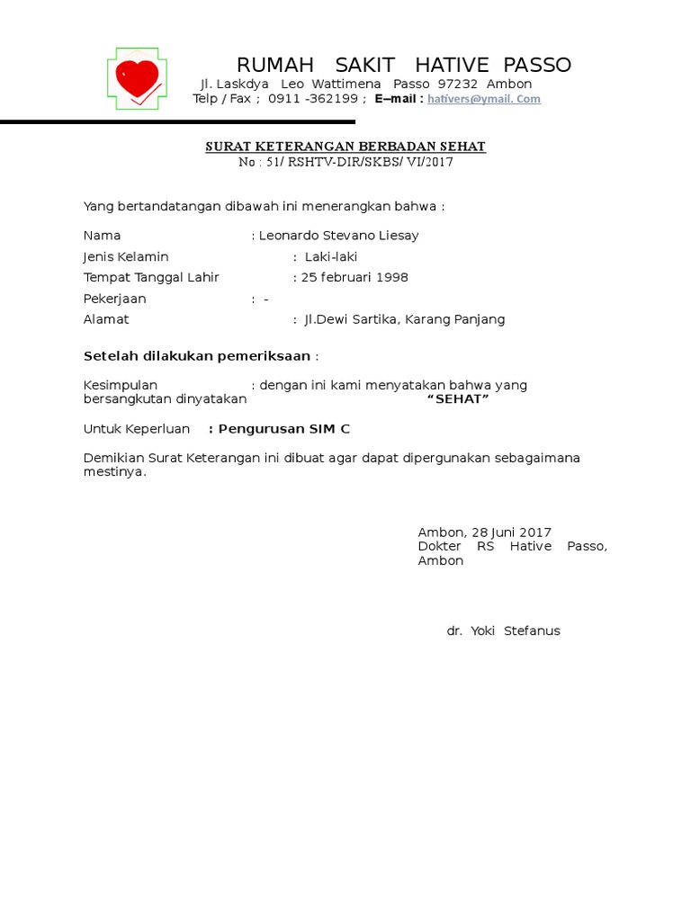 Surat Keterangan Sehat ini dibuat guna keperluan perpanjangan SIM C. Contoh Form Surat Keterangan Sehat KOP SURAT INSTANSI KESEHATAN. Contoh surat keterangan sehat sendiri bisa dilihat dari berbagai sumber, mulai dari puskesmas, dokter hingga rumah sakit.