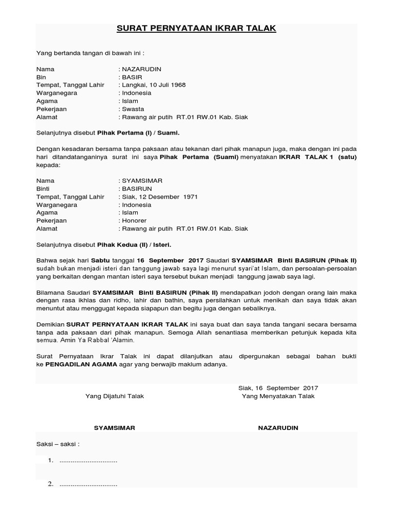 Contoh Surat Talak Cerai. Tetapi keadaan dan alasan-alasan yang lain yang kemungkinan menjadi penyebab terjadinya perceraian tersebut. Demikian SURAT PERNYATAAN IKRAR TALAK ini saya buat dan saya tanda tangani secara. bersama tanpa ada paksaan dari pihak manapun. surat kuasa cerai talak.