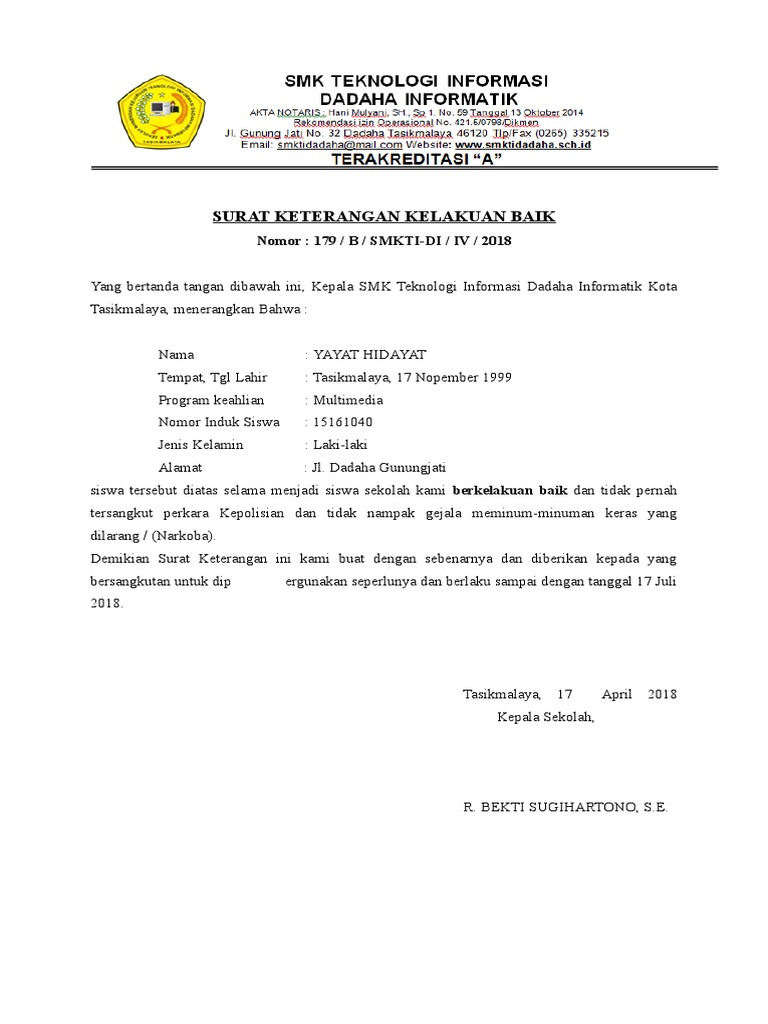 Surat Keterangan Kelakuan Baik. Demikian surat keterangan ini dibuat untuk dipergunakan sebagai bahan persyaratan mengikuti seleksi Penerimaan Peserta Didik Baru (PPDB) pada sekolah lanjutan. Susunan surat tersebut terdiri dari kop.